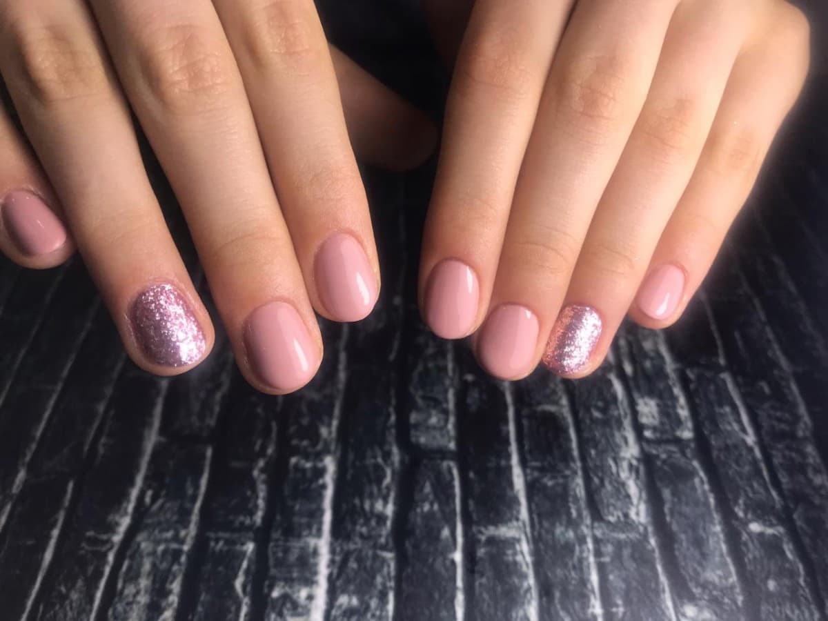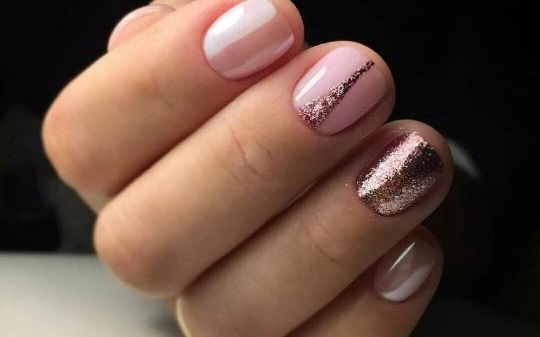 Такой вид декора, как блёстки просто идеально подходит для украшения коротких ногтей, поскольку блестящие частицы имеют разный размер, цвет и форму, а также лишены объёма, что позволит избежать в процессе оформления визуального утяжеления ногтевых пластин в целом. Нежный маникюр с блёстками, который стал одним из трендовых, представляет собой лаконичные идеи оформления в светлых тонах с минимальным количеством сверкающих деталей. Иными словами, блёстки приемлемо использовать для дополнения рисунка либо особенностей выбранной техники, например, прорисовки линии улыбки френча при помощи глиттера либо шиммера.