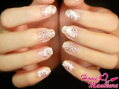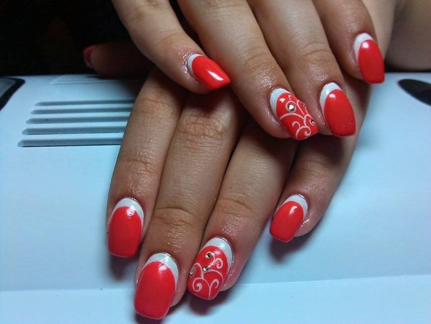 Яркий праздничный дизайн, выполненный на коротких ноготках, нарощенных гелем, смотрится особенно эффектно. Ведь материал не только удлиняет маленькие кончики, но и выравнивает поверхность ногтевой пластины. Цветочки, кружево, стразы и глиттер – идеальный вариант декорирования. Создавая дизайн, не используйте слишком крупные элементы, утяжеляющие маникюр. На фото вы можете увидеть, как выглядят коротко нарощенные ногти в праздничном оформлении.