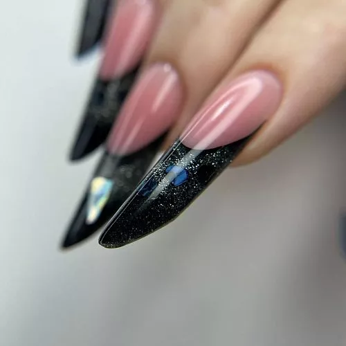 На транспарентной основе с помощью блесток можно создать любой дизайн: витиеватый орнамент, строгую геометрическую фигуру или просто градиент. Цвет блесток может быть любым — от сдержанного металлика до разноцветного.