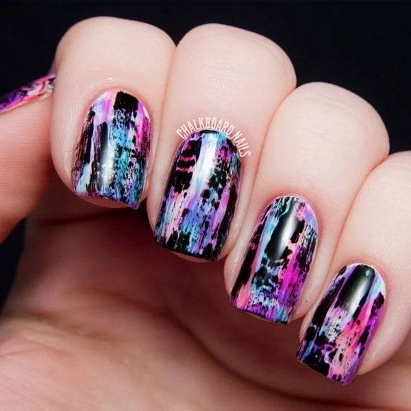 Паутинка, прямые или хаотично перекрещенные линии, решетка, отдельные геометрические фигуры — бесцветная основа сделает любой простой рисунок концептуальным. Это уже не обычные полоски и сплетение линий, а нечто особенное, со смыслом. Кроме того, на прозрачном лаке любой цвет выглядит контрастным и заметным, поэтому есть возможность в полной мере удовлетворить свою любовь к какому-либо оттенку.