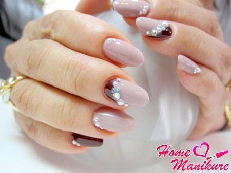 - Если девушка поддерживает романтический образ, раскрасить ногти лучше тёплыми, постельными тонами лака. На них жемчужный декор будет смотреться особенно нежно.
