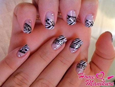 Так же не стоит забывать про разнообразные рисунки, они очень эффектно смотреться и могут служить отличным удлинителем ногтя. Смелым решением будет, например звериный принт. Его можно так же распределить по всем ногтям или сделать акцент на одном ногте.