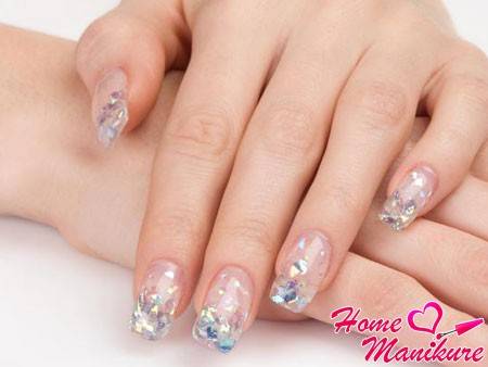 Небольшие фрагменты битого стекла, украшающие прозрачную основу — очень гармоничное и одновременно контрастное сочетание. Сияющий декор идеально перекликается с глянцем основного покрытия, а его переливчатый эффект выгодно обыгрывает монотонность прозрачного лака.