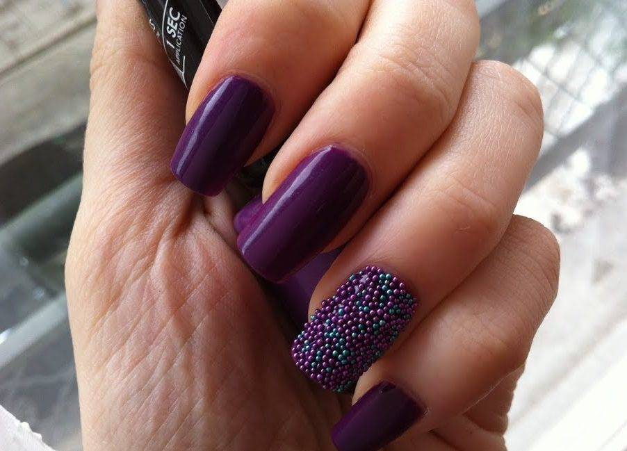 Необычное покрытие с использованием так называемых бульонок – специальных бусин (бисера). Величина этих декоративных элементов разная. Бусины бывают размером с песчинку или небольшой страз. Бульонки закрепляют на покрытии с помощью специального клея. Такой маникюр отлично смотрится, однако бусины имеют свойство отваливаться, если обращаться с ними неаккуратно