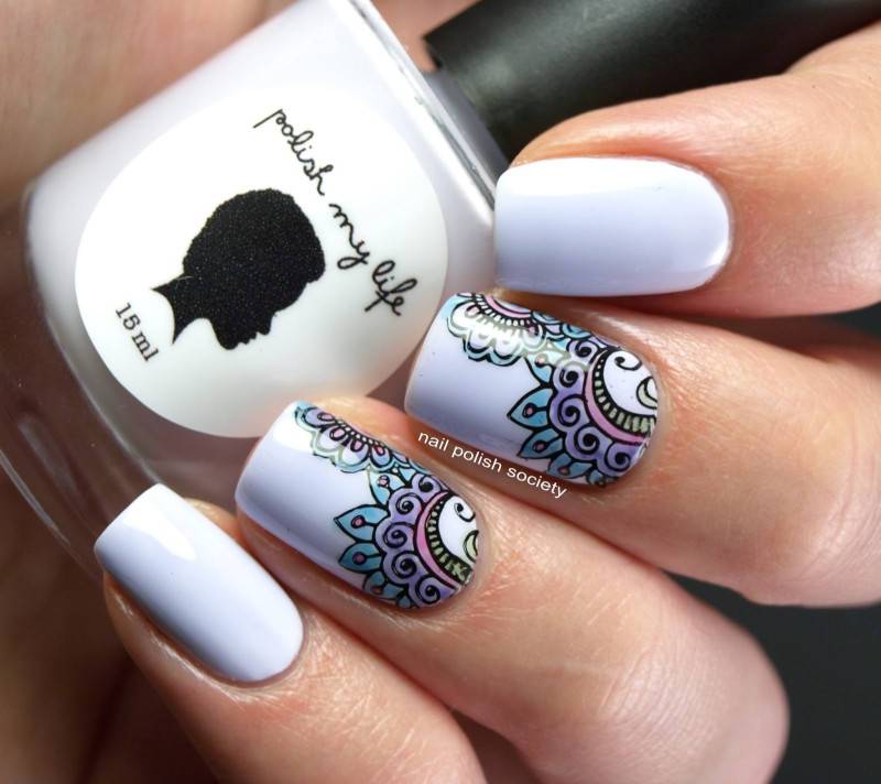 Помимо ярких оттенков в турецком маникюре преобладают серебряные и золотые тона. Узоры стемпингом шикарно смотрятся на синем или белом фоне. Стоит учитывать, что турецкие мотивы выглядят на ногтях достаточно объемно, поэтому варьируйте размер рисунка в зависимости от длины и ширины ногтевой пластины.