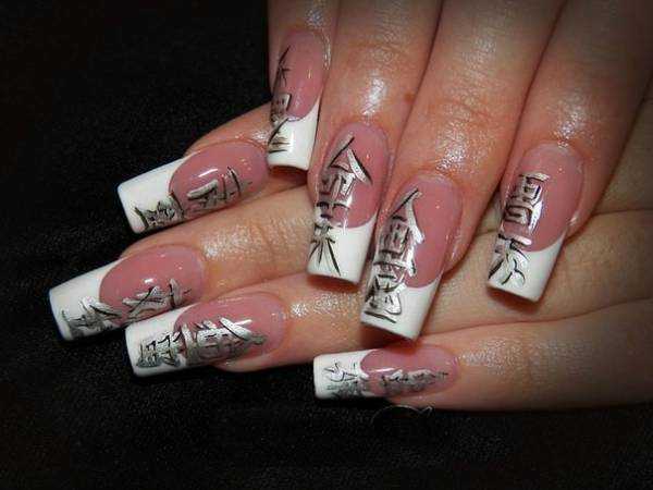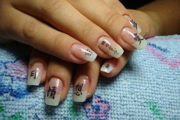 Для подобного маникюра лучше всего подойдет средняя длина ногтей. На коротких ногтях иероглифы смотрятся не так красиво.