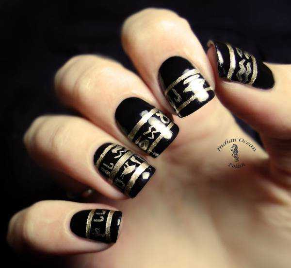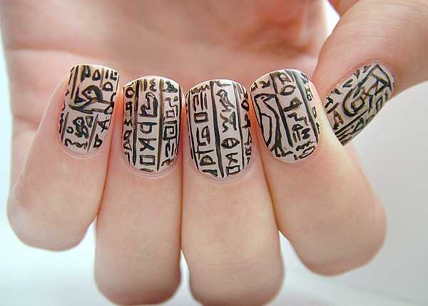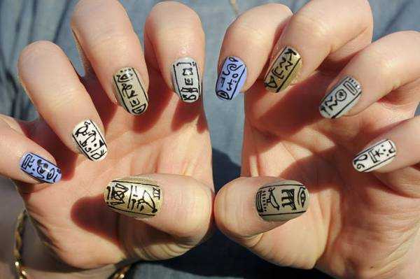 Чаще всего на ногтях изображают китайские или японские иероглифы. Воспроизвести их не так сложно. Но настоящие ценители восточной культуры знают, что можно использовать еще и египетские иероглифы. Они немного отличаются от китайских. Маникюр с египетскими иероглифами более сложен к выполнению, поскольку символы состоят из множества мелких черточек и линий. Повторить их – непростая задача.
