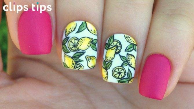 Древесно-плодовая тема. Растительные орнаменты можно наносить по строгому шаблону или на каждом ноготке изображать разные стебельки, веточки, листики, травы. Довольно просто рисовать фрукты и ягоды: ломтики арбуза, сочные цитрусовые, вишенки, клубнику, малину.