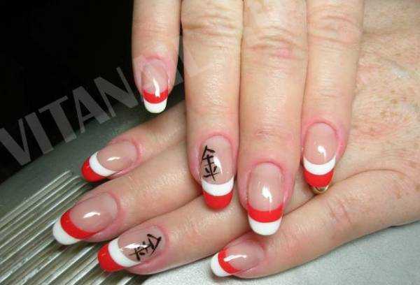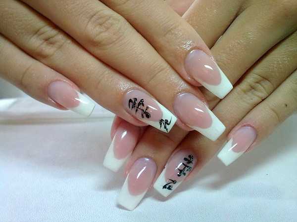 Французский маникюр с китайскими иероглифами – очень распространенный дизайн. Самой благоприятной основой для иероглифов является классический френч. Белоснежный краешек и китайские символы создадут превосходный симбиоз. Но ярко-красные или розовые «улыбки» станут неплохой альтернативой традиционному варианту.