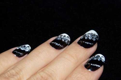 Далее аккуратно заполняется черным лаком левую часть ногтя. Это необходимо сделать максимально аккуратно.