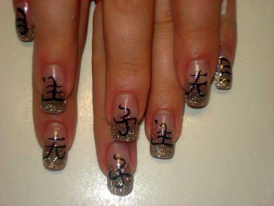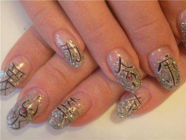 Надписи, иероглифы. Чтобы вычерчивать красивые буквы, древние мастера осваивали искусство каллиграфии. А чтобы сделать простенькие надписи на пластине, достаточно знать алфавит и немножко владеть кистью. Слова можно растянуть на всю руку или уместить на одном пальце. Интересно выглядит имитация пульса из завитков, кайма из металлических знаков, несложные иероглифы на темном фоне. Тонкие, вытянутые в длину надписи очень мило смотрятся на коротких ногтях, а длинные коготки хорошо дополнят хаотично разбросанные буквы.