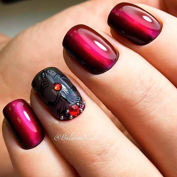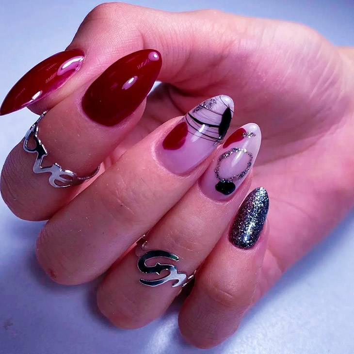 В таком маникюре сталкиваются все страсти одновременно. Нейл-мастер получает простор для фантазии.