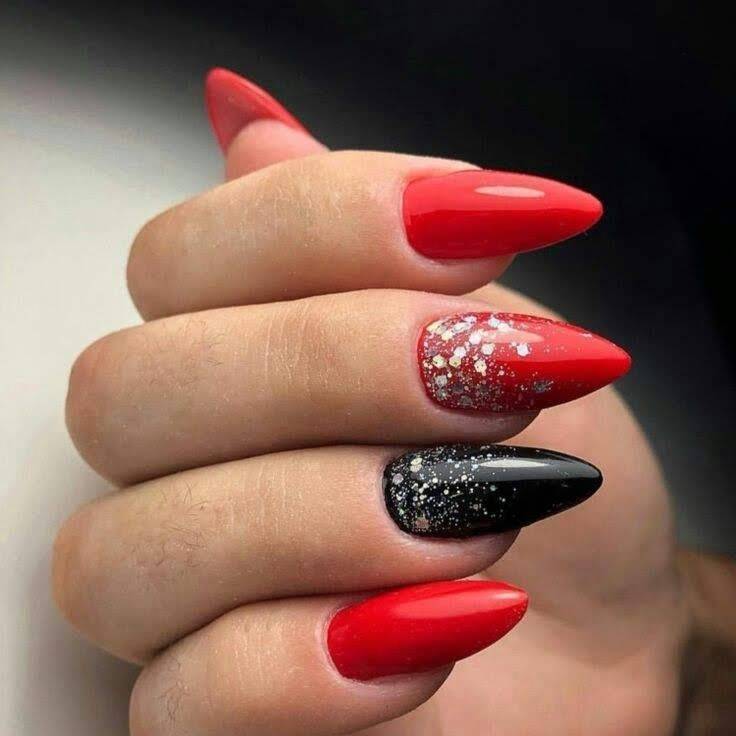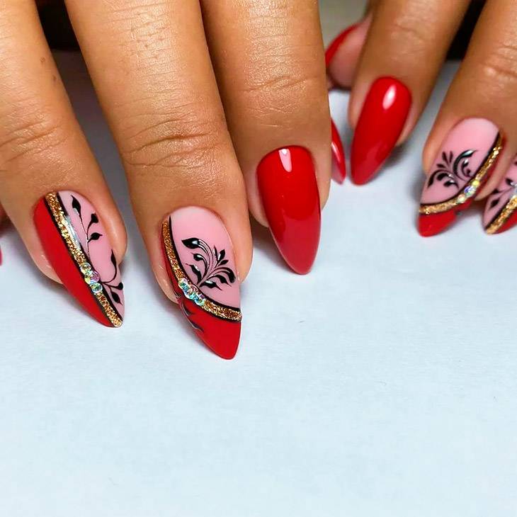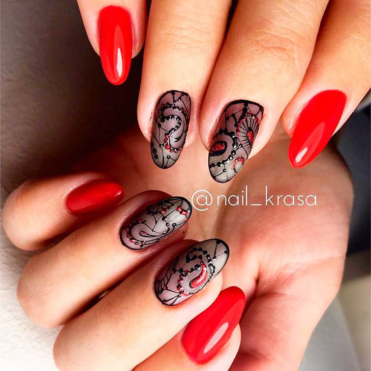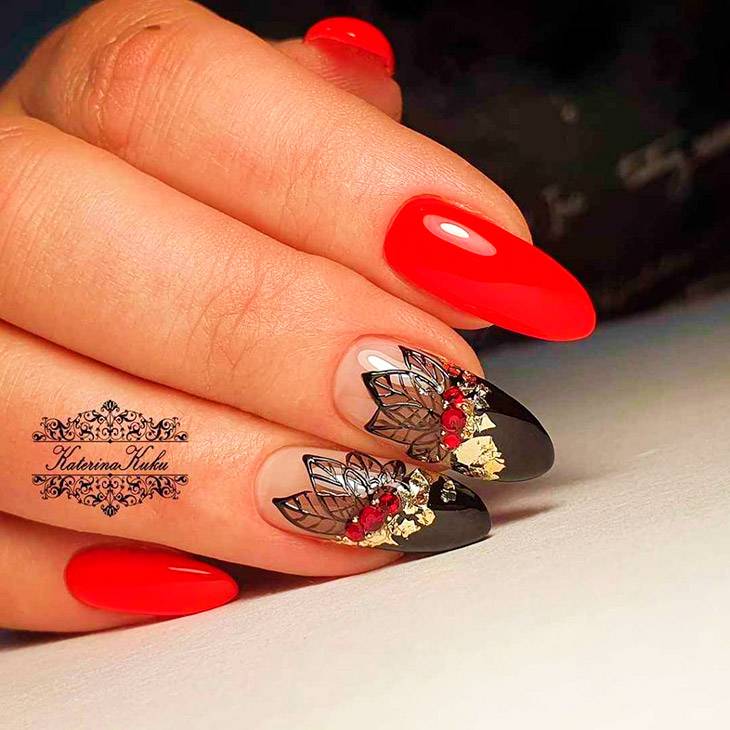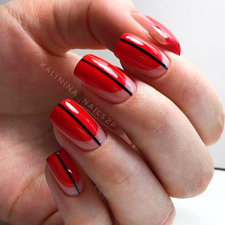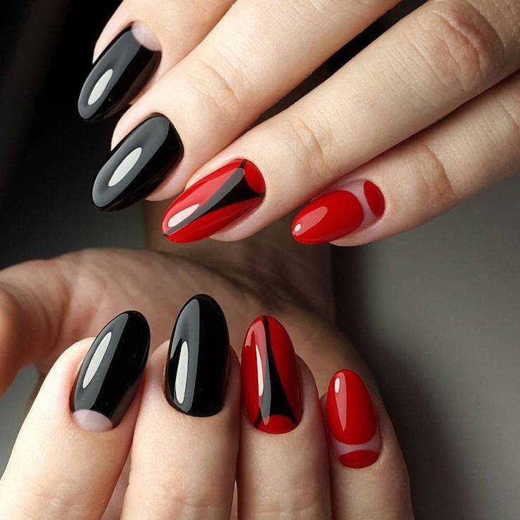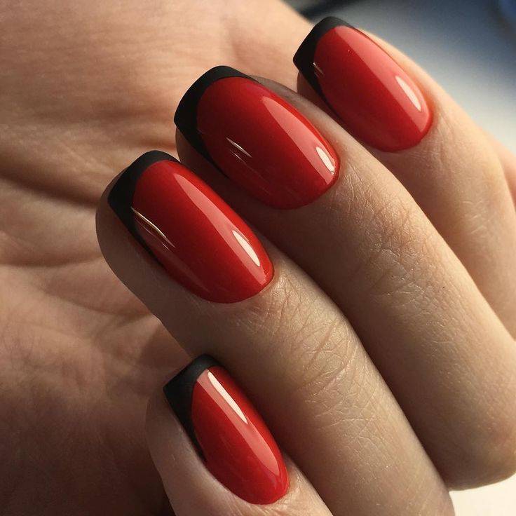 Красные ноготки в сочетании с чёрным. Комбинация этих двух тонов считается неизменной классикой. Чёрный будет служить акцентным цветом, поэтому им лучше делать рисунки, полоски, абстрактные линии на красном. В оформлении допустимы стразы, блёстки.