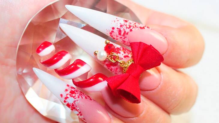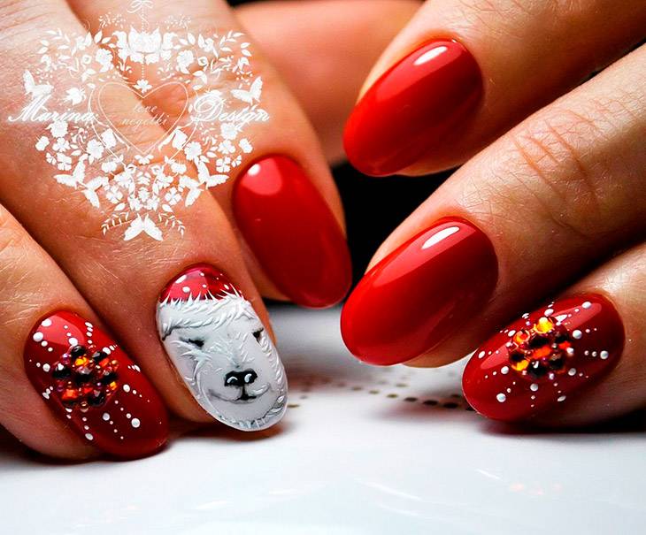 Праздничный красный маникюр тогда считается удачным, когда он гармонирует с нарядом, имеет яркий дизайн, выполненный со вкусом. Декор предполагает наличие одного или пары красных аксессуаров, а вот по части элементов он практически не ограничен, главное, чтобы они не выбивались из общего стиля и сочетались с украшениями.