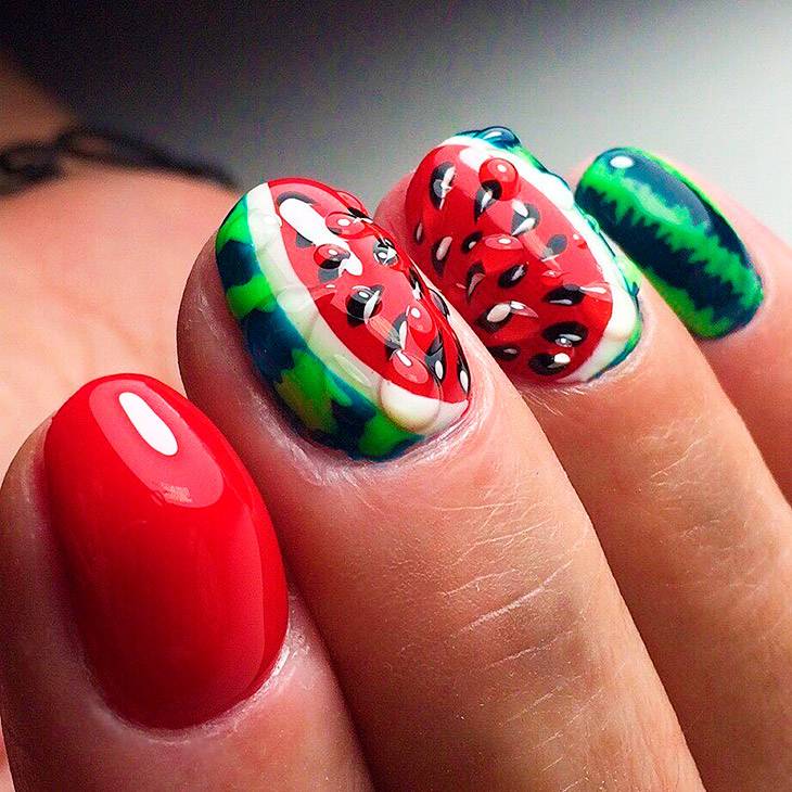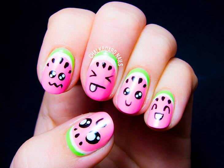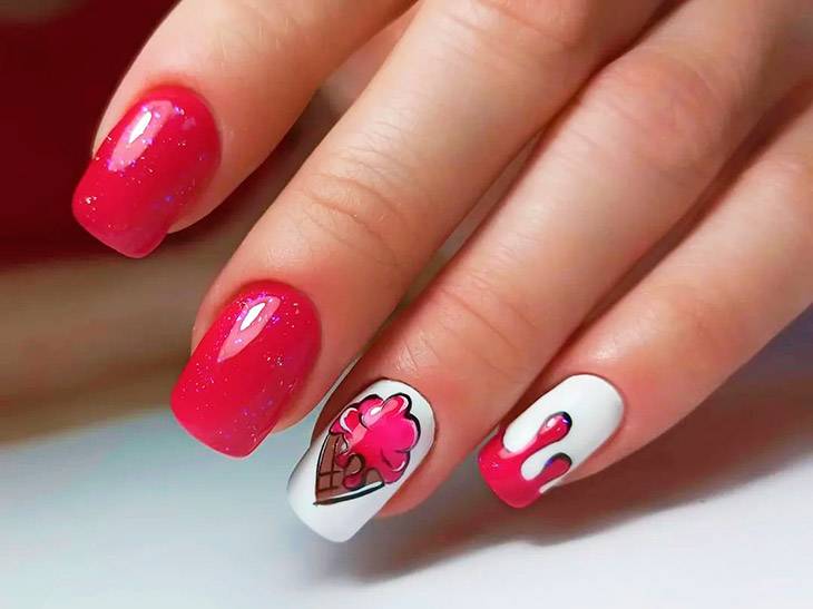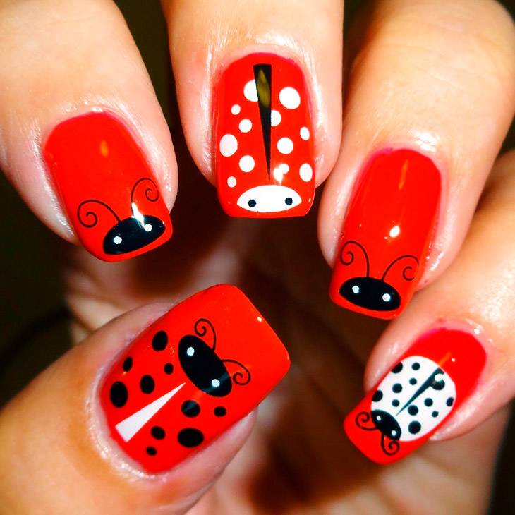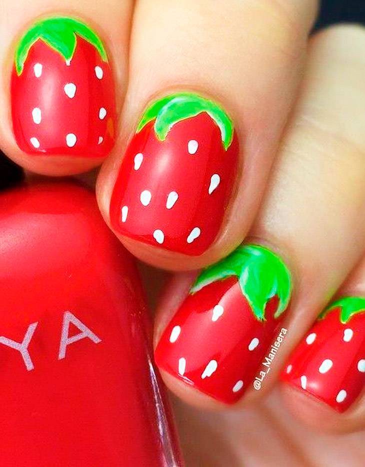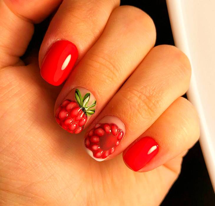 На бесцветных и нюдовых обычно что-нибудь изображают – сердечко, персонажа мультфильма, бабочку, на ярких, разноцветных – чаще всего наносят точки, брызги, звездочки. Красные короткие ноготки нередко украшают и ягодным, цветочным или фруктовым дизайном (наклейки и рисунки).
