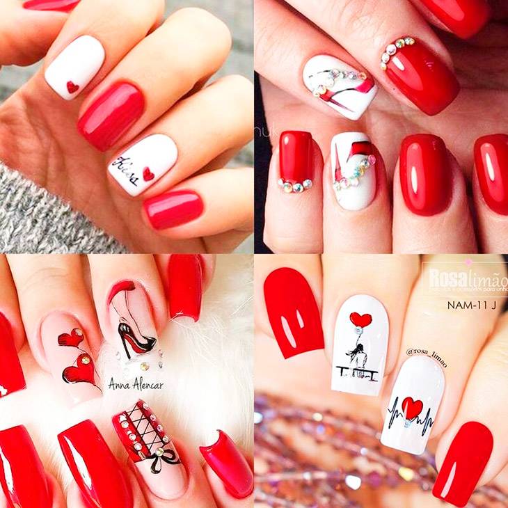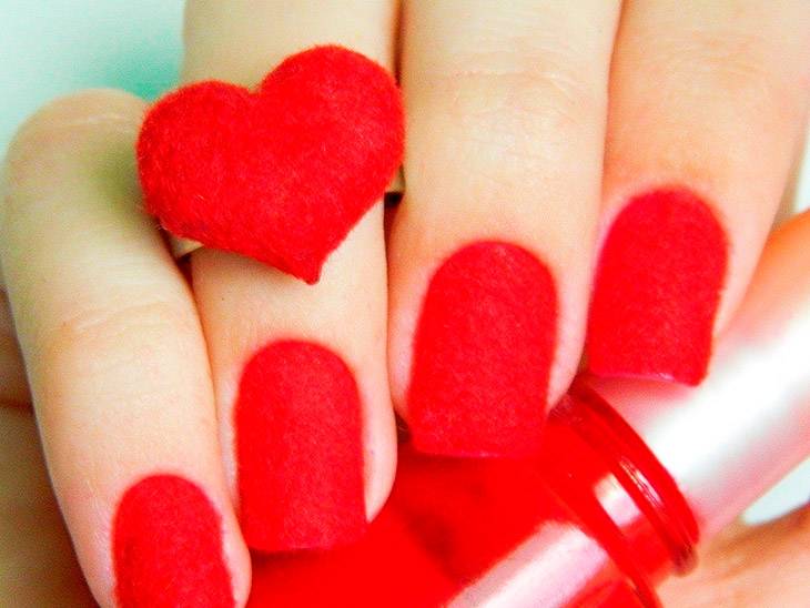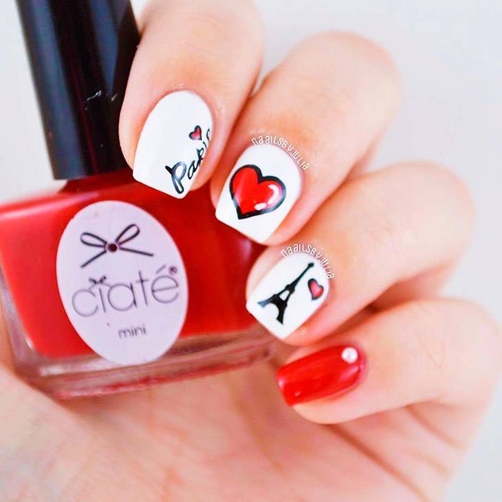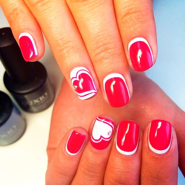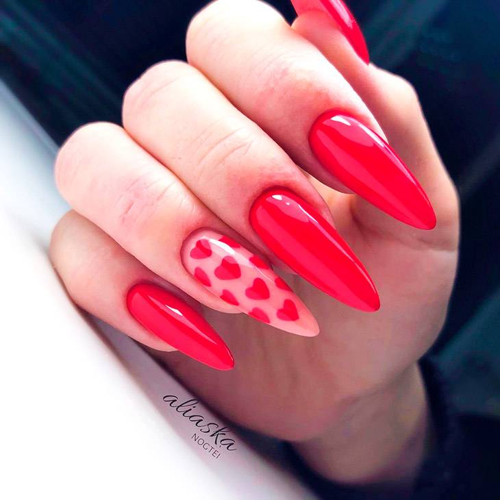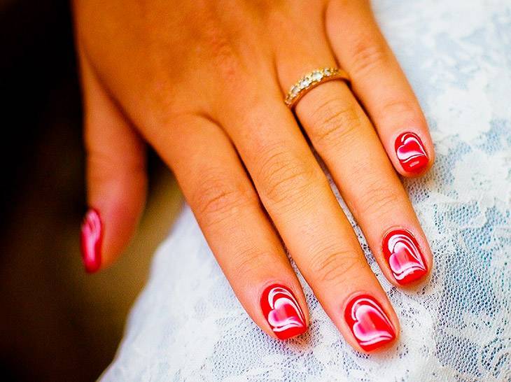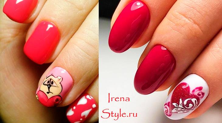 На сегодняшний день одним из самых популярных дизайнов для выполнения маникюра считается стиль минимализм. Такой маникюр — неброский, приятный на вид и абсолютно не надоедает при долгом ношении на ноготках. Красный цвет при выполнении данного дизайна смотрится восхитительно. Очень мило и нежно выглядят арки, которые наносятся по овалу ноготка выполнены красным цветом. При этом основа может быть нюдового, белого или пастельного цвета. Но самым трендовым дизайном в стиле минимализм принято считать однотонную основу прозрачного тона с красными сердечками небольшого размера на одном ноготке.
