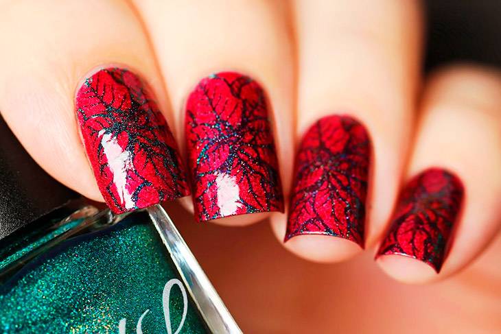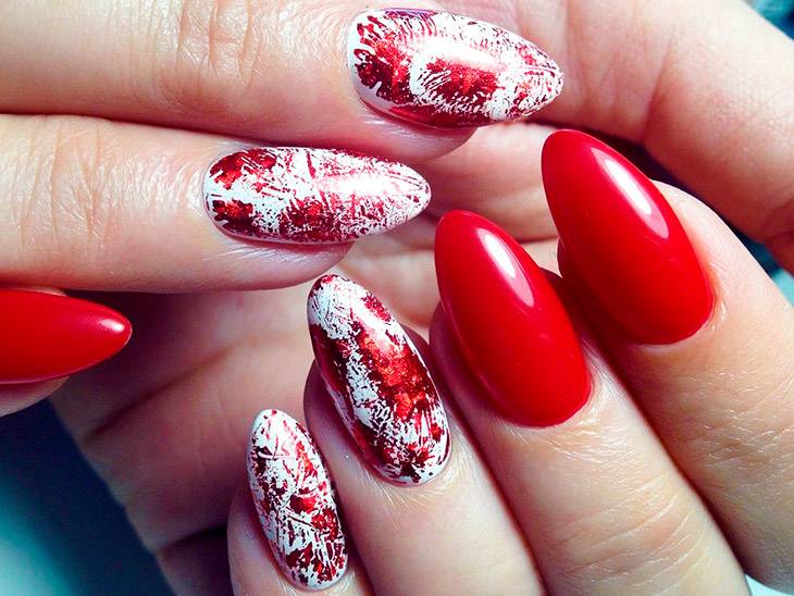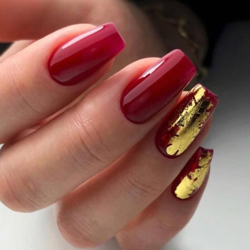 В nail-дизайне часто используют тонкую фольгу, которая удачно сочетается с красным лаком. Для маникюра применяют кусочки произвольной формы или полоски декорированного материала. Такой дизайн придает свежесть и неповторимость образу. Декор обычно применяют для 2-4 ногтей из 10. Можно использовать фольгу на каждом, но в малых количествах во избежание перегрузки маникюра. Правила применения: