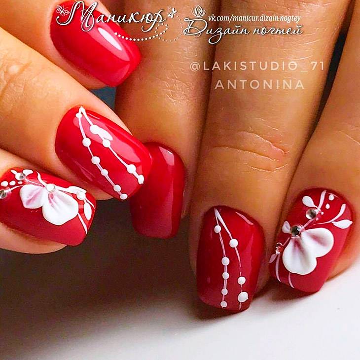 Шеллак красный с белым. Такое сочетание является наиболее востребованным и привлекательным. Белым цветом можно выполнить кружевной узор на яркой основе, сделать френч, нарисовать цветок или другое изображение.