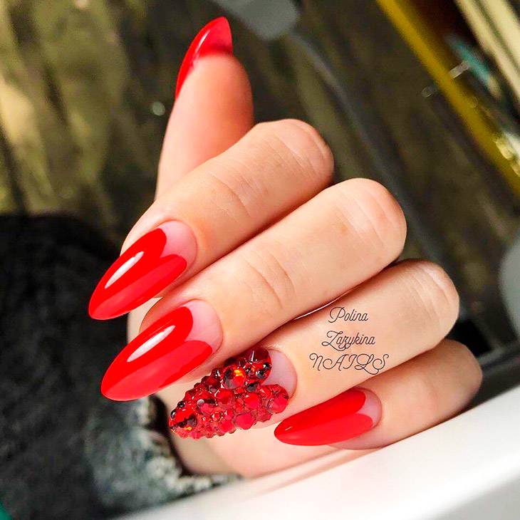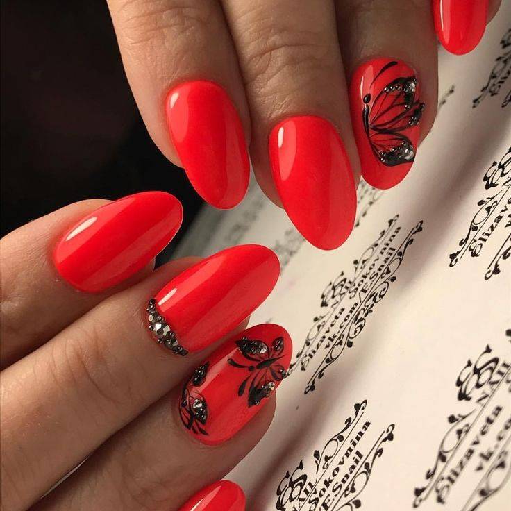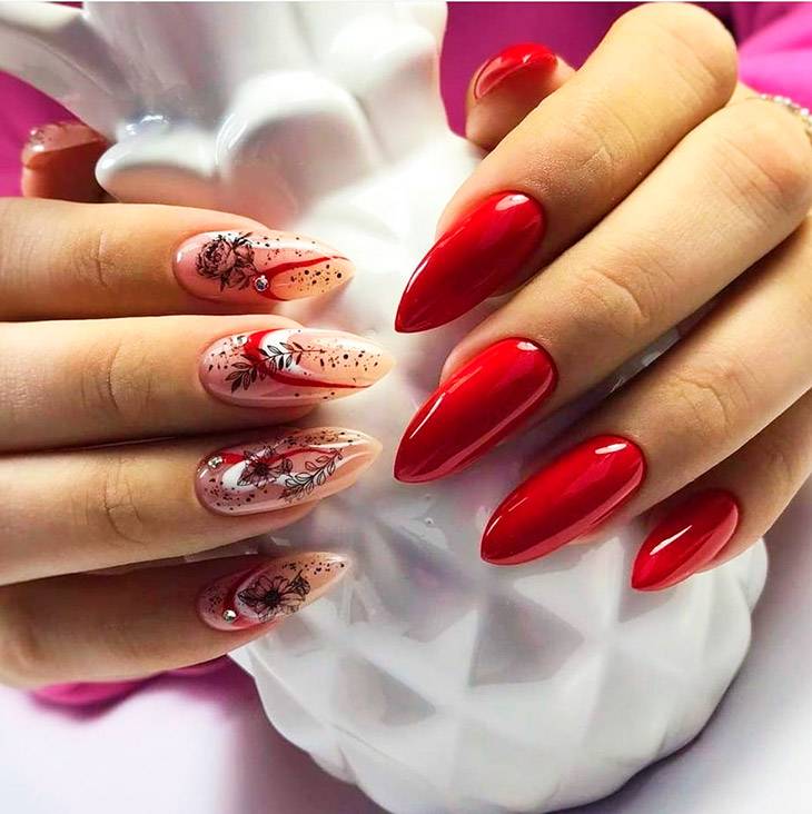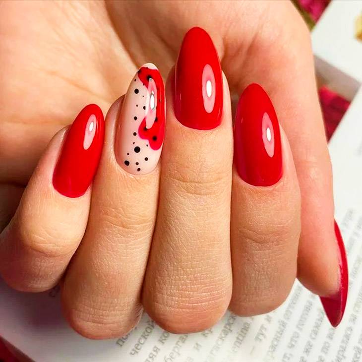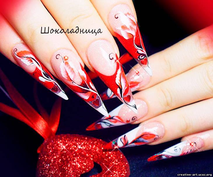 Невозможно найти девушку или женщину, отдающим предпочтение длинным ногтям, и ни разу не окрасившим ногти в оттенки красного цвета. Длинные ногти напрашиваются на маникюр в исполнении дизайна, основой которого является именно красный цвет! Форма ногтей может быть любая: квадратная, округлая или миндалевидная. Длинные ногтей сами по себе требуют постоянный контроль над поддержанием их формы.