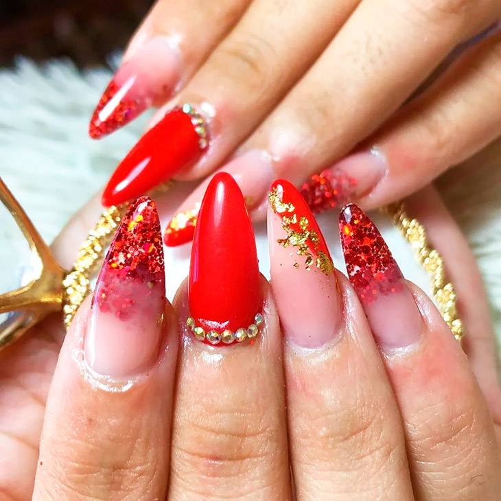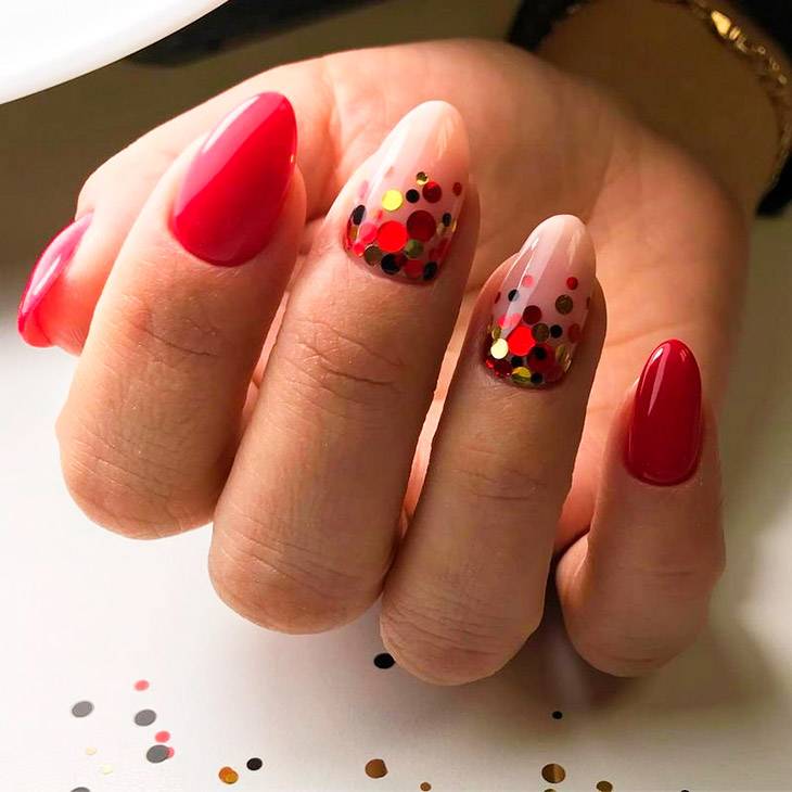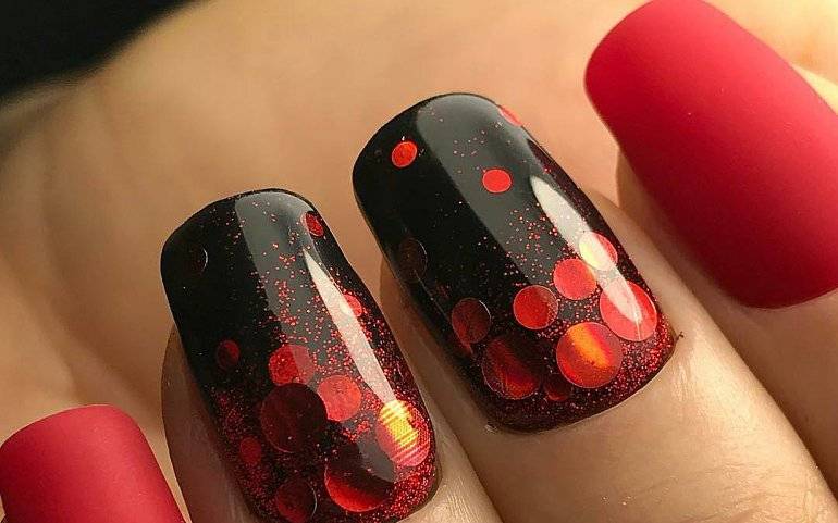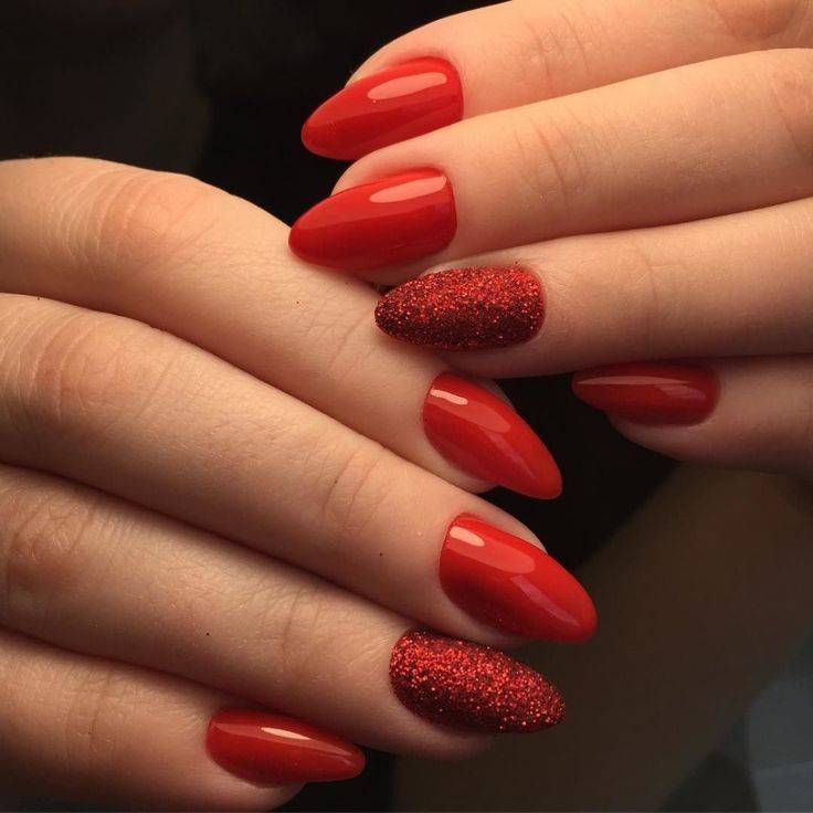 Красные ногти можно украсить блестками. Мы рассмотрим этот вид дизайна более подробно, поскольку с блестками можно создавать очень интересные образы.