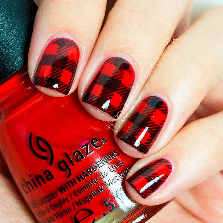 Фото 4. В этом случае мы видим красный маникюр с блестками с использованием градиента и клетчатым рисунком. Для его создания сперва наносим на ногти блестящее красное покрытие, затем с помощью губки наносим черный лак. Полсе этого тонкой кистью рисуем клетку и покрываем все топом.