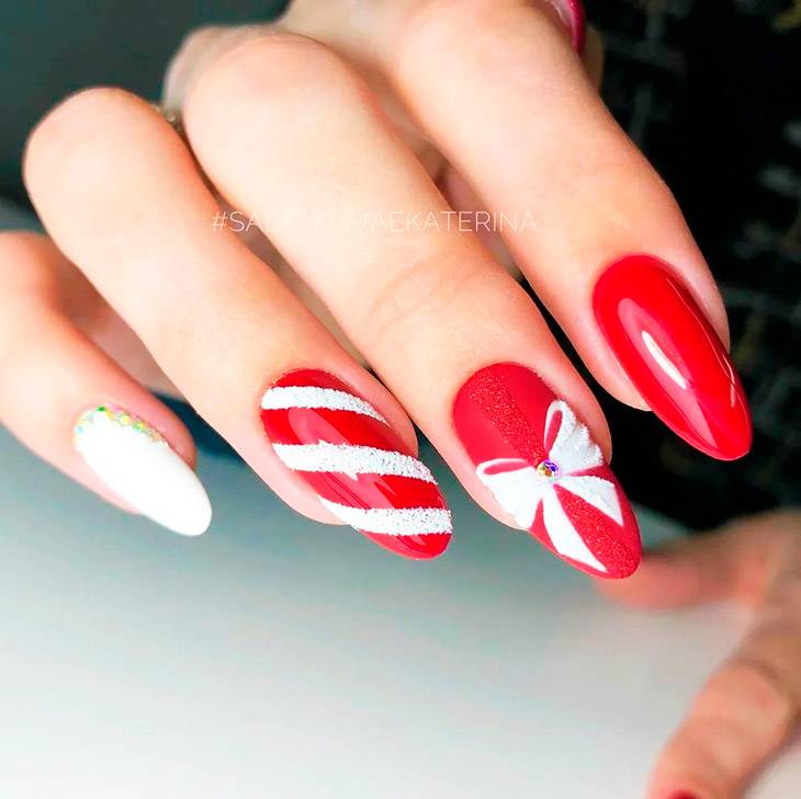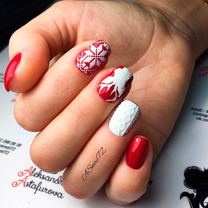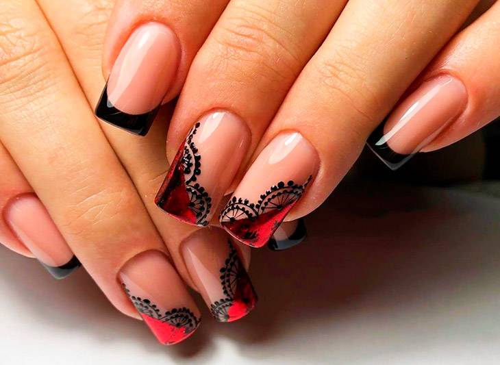Если за основу взят красный, то белый и чёрный дополняют его незначительными включениями. При этом чёрным часто оформляют линию улыбки или лунки. Белый добавляют в виде матовых страз.