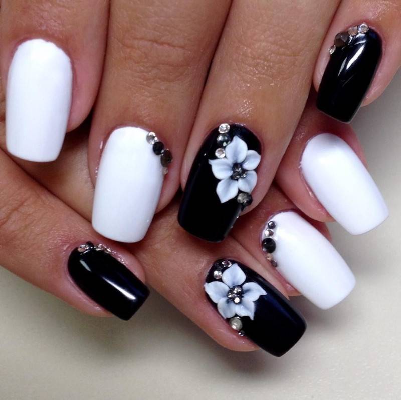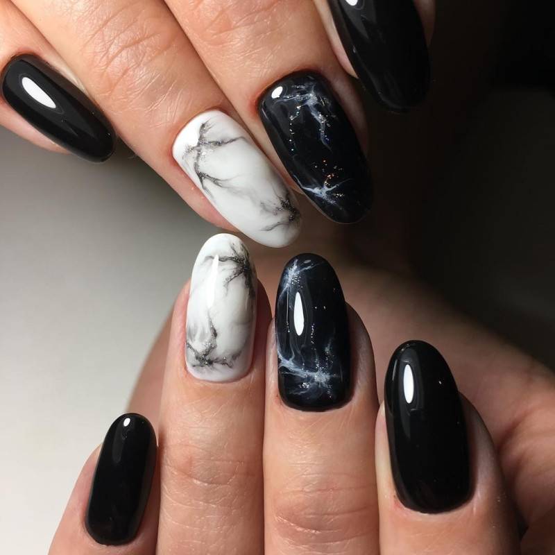 Набирает популярность мраморный маникюр, подходящий к ногтям небольшой длины, а также футуристический ромбовидный дизайн с глянцевыми витражами и гелевыми пластинами. В качестве новой черно-белой дизайнерской идеи возможно применение гель-лака, а также всевозможным металлических пигментов, а также набирающие популярность вставки.