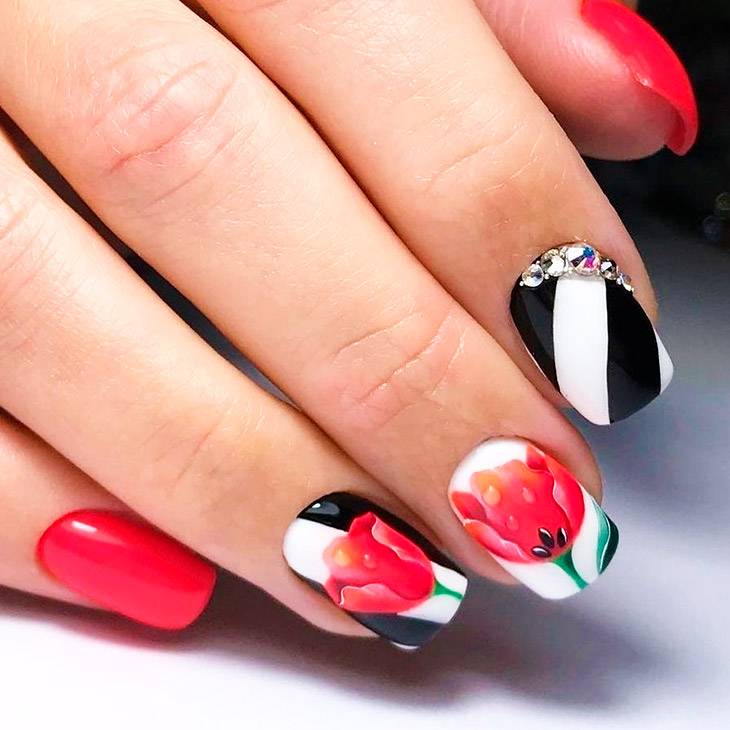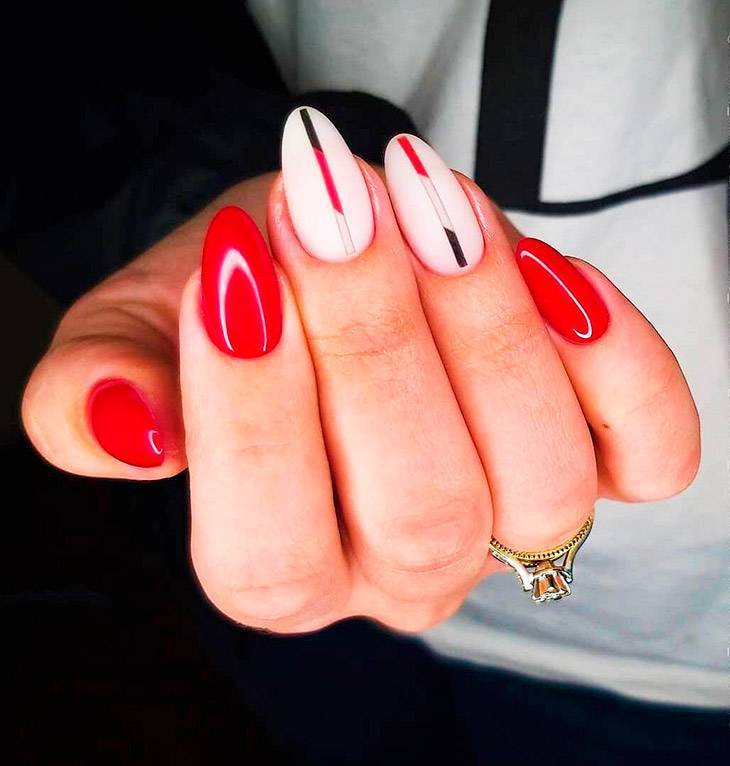 Маникюр с красным цветом необязательно должен быть монохромным. Идеи применения яркого лака разнообразны: