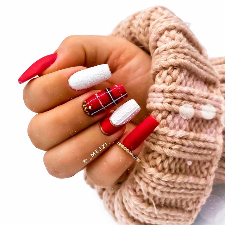 Фото 1. Здесь мы видим блестящий красный френч с рисунком в виде клеточек. Чтобы его сделать, сначала красим ногти красным лаком с блестками, а затем тонкой кистью рисуем клетку на ногтях. После этого с помощью трафарета делаем френч. Далее покрываем наш дизайн верхним покрытием для создания глянцевого блеска.