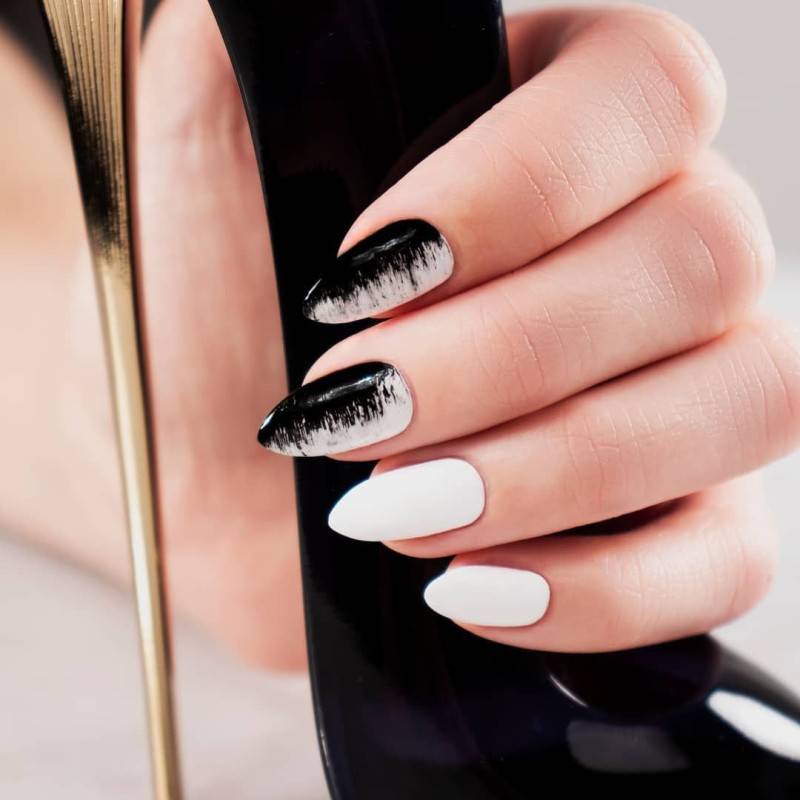 Сочетание черно-белых гель лаков либо шеллаком на ногтях