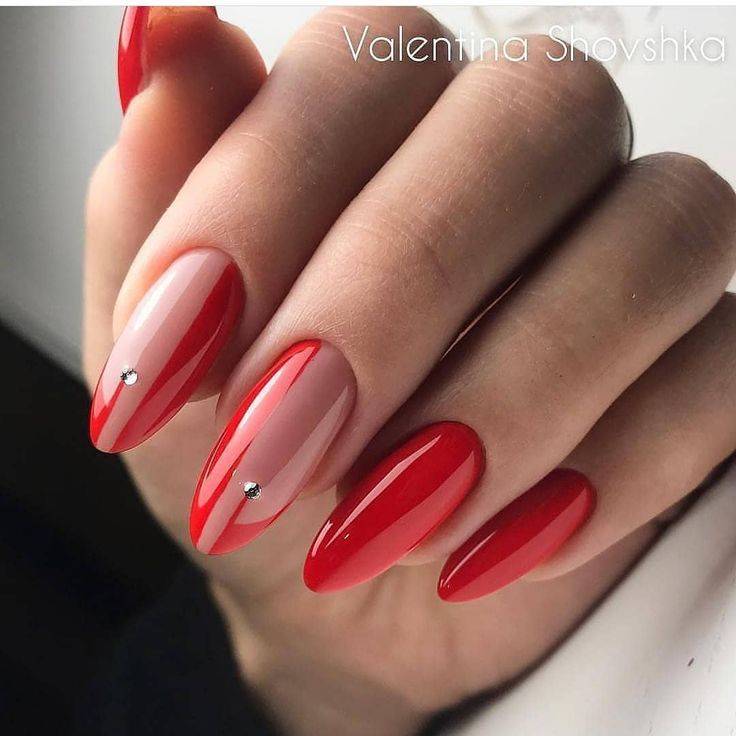 Красивые красные ногти с нюдом. Выбирать нежные нюдовые оттенки стоит для офисного или романтичного маникюра. Они помогают приглушить яркость красной основы, придают дизайну более скромный, нейтральный вид.