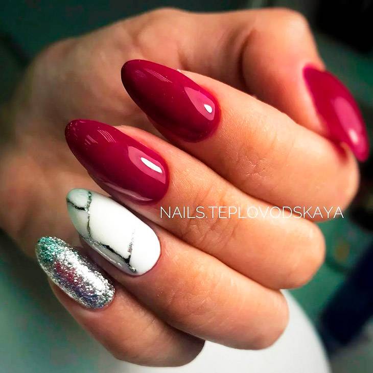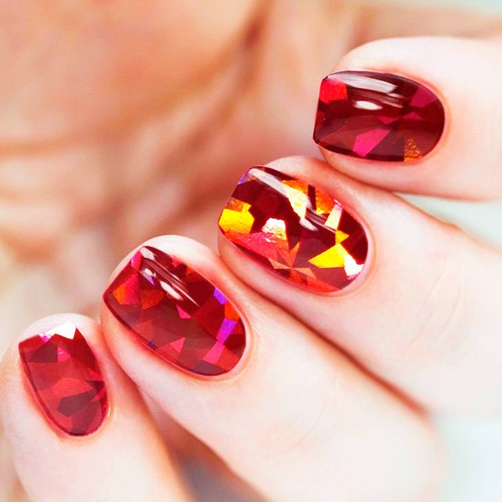 Очень эффектно выглядит красный маникюр в стиле “битое стекло”. Для его создания используется специальная фольга, которая нарезается крупными кусочками и прикладывается на невысушенные красные ногти. Сверху все обильно покрывается топовым покрытием в несколько слоев.