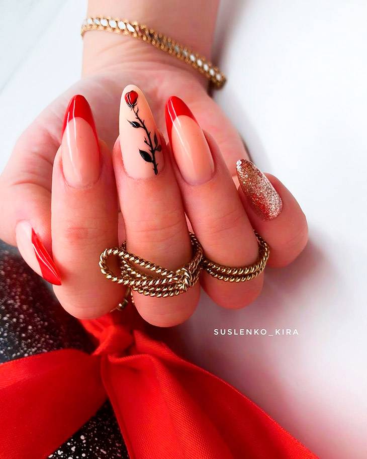 Идеи красного маникюра включают в себя nail-art – это техника рисования на ногтях, подходящая для женщин любого возраста. Ее подбирают, исходя из модных тенденций, времени года и предпочтений клиентки.