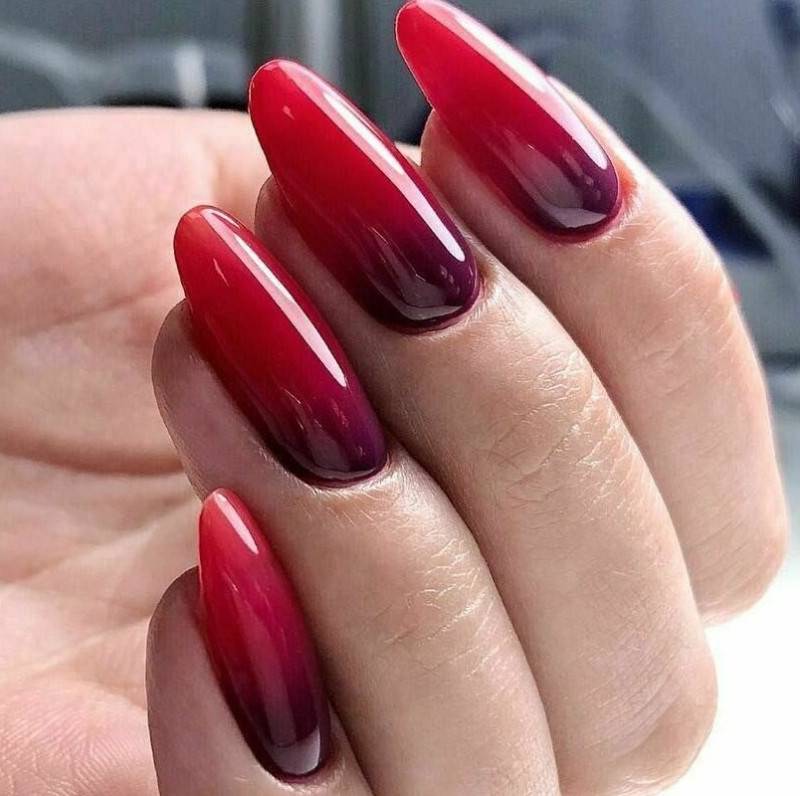 Красно-розовый маникюр. Для этой комбинации идеальна техника омбре или градиента. Переход от красных оттенков к нежным розовым даёт потрясающий зрительный эффект, настраивает на романтический лад. Темные тона лучше располагать ближе к основанию ноготка, светлые – на кончиках.