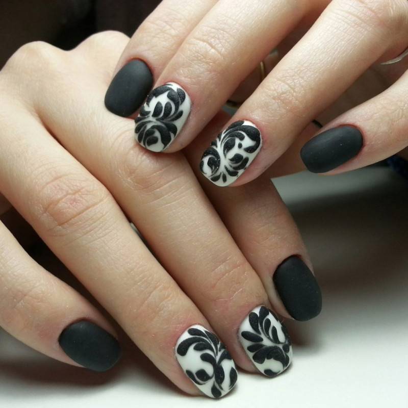 Маникюр с черным лаком и с дизайном. Дизайн может быть любой. Это могут быть узоры, вензеля, различные завитушки.