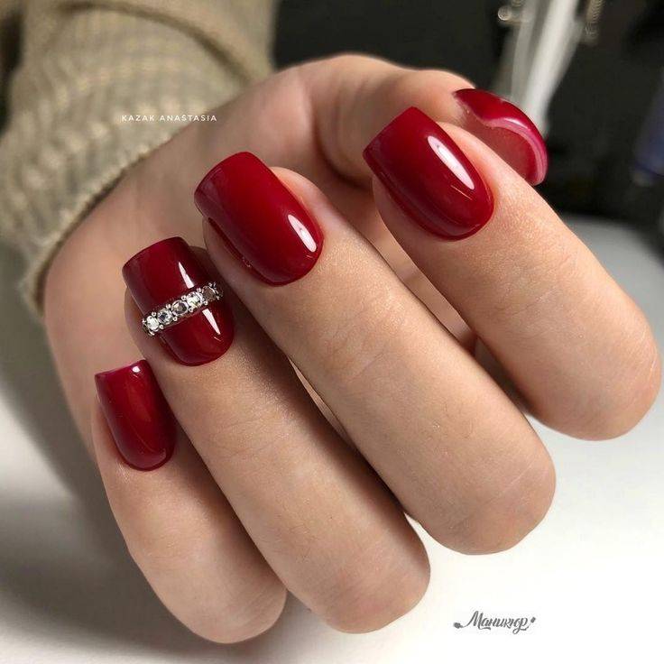 Красный маникюр чаще всего неуместен в условиях офиса, берется бордовый на коротких или средних ногтях с лаконичным дизайном.