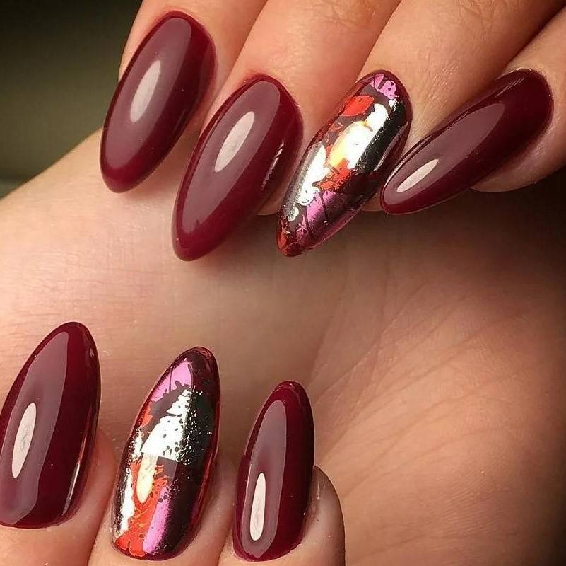 В nail-дизайне часто используют тонкую фольгу, которая удачно сочетается с красным лаком. Для маникюра применяют кусочки произвольной формы или полоски декорированного материала. Такой дизайн придает свежесть и неповторимость образу. Декор обычно применяют для 2-4 ногтей из 10. Можно использовать фольгу на каждом, но в малых количествах во избежание перегрузки маникюра. Правила применения: