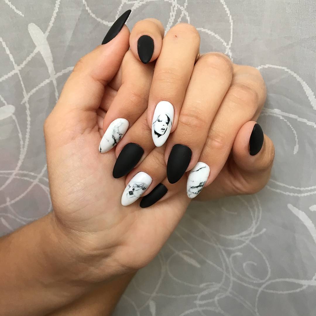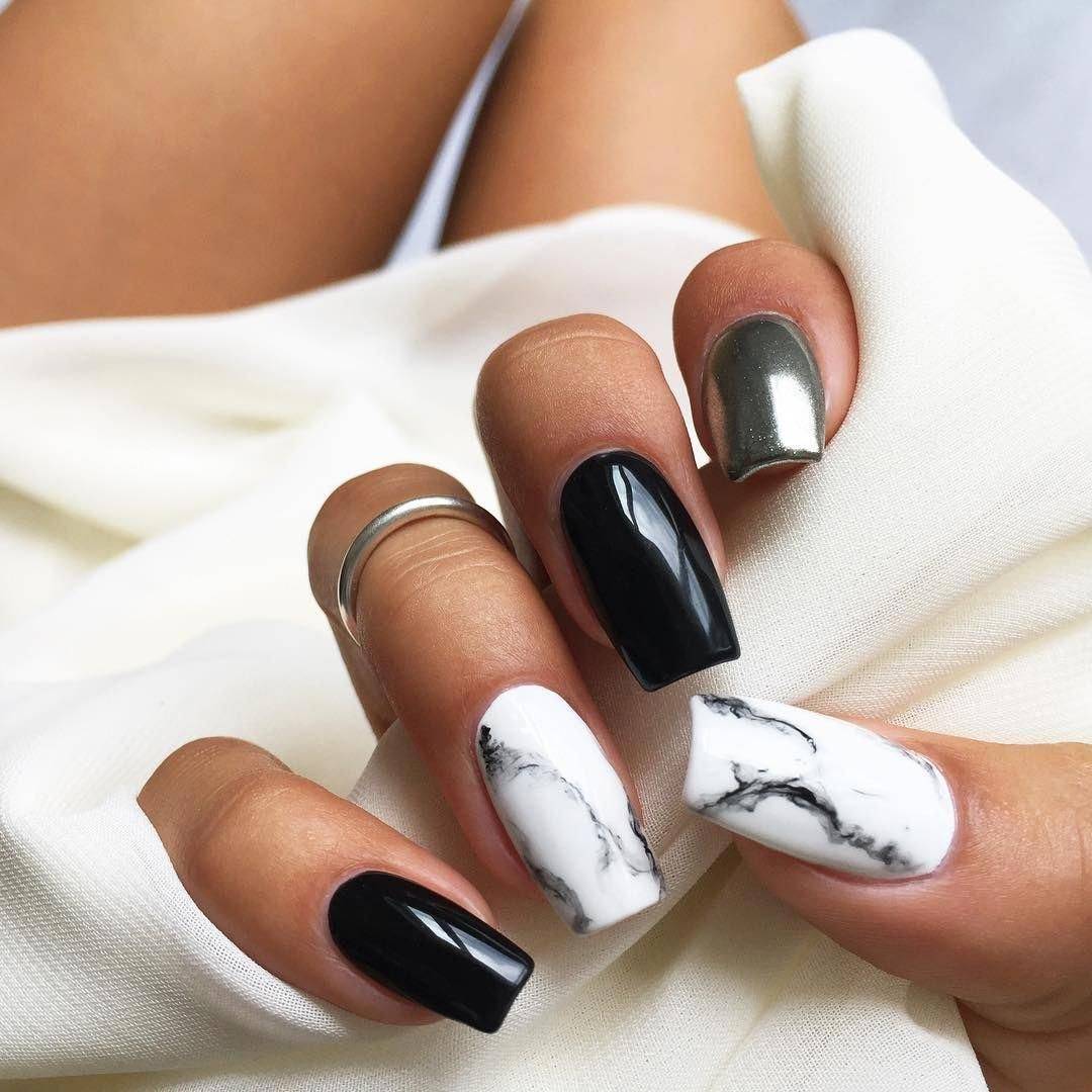 Набирает популярность мраморный маникюр, подходящий к ногтям небольшой длины, а также футуристический ромбовидный дизайн с глянцевыми витражами и гелевыми пластинами. В качестве новой черно-белой дизайнерской идеи возможно применение гель-лака, а также всевозможным металлических пигментов, а также набирающие популярность вставки.