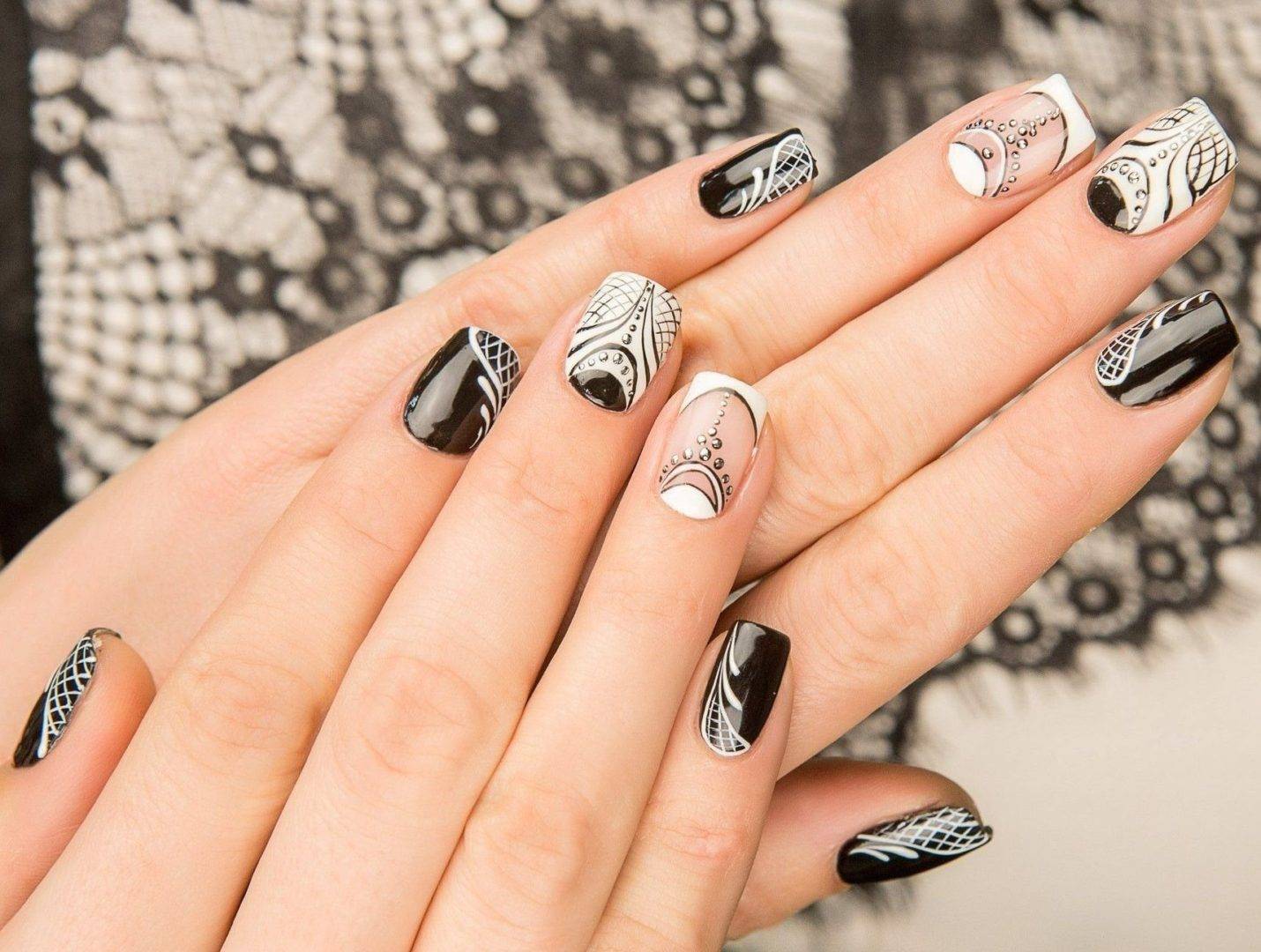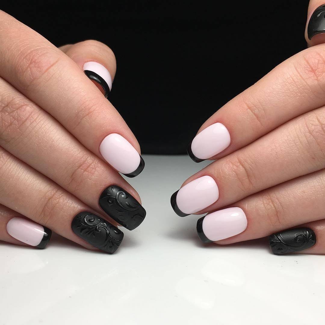 Вы также можете выбрать простой дизайн с великолепными деталями или ногти с инкрустацией, которые в настоящее время в тренде. Сочетание черного с белым на короткие ногти есть возможность выполнить в различных техниках, выделяя несколько ногтей.