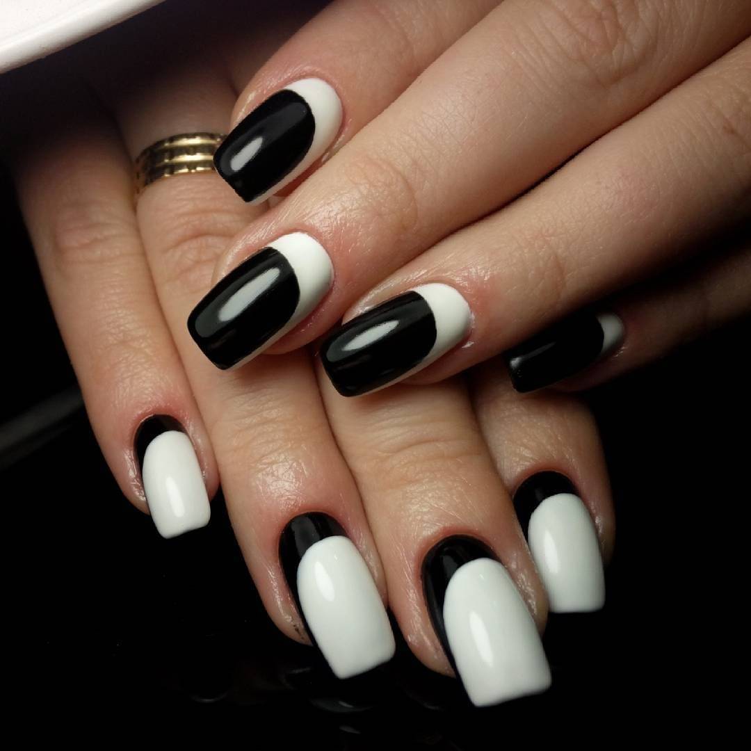 Сочетание черно-белых гель лаков либо шеллаком на ногтях