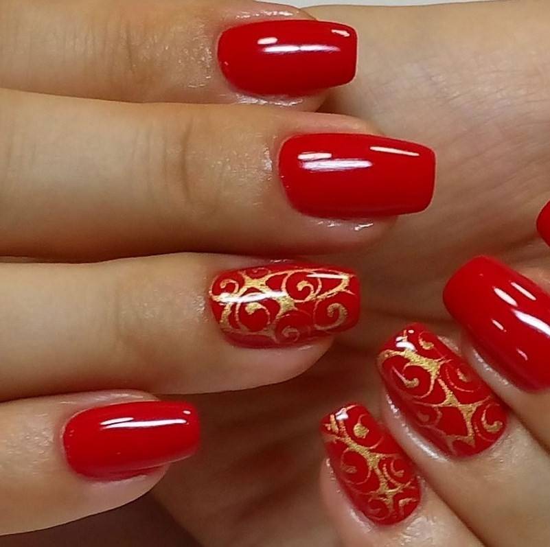 Благодаря потали красный станет ещё многограннее и выразительные. Именно поэтому выбирают гель – лак переливающийся золотом.