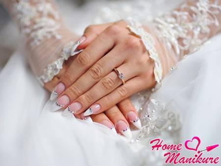 Обладательницы длинных ногтей могут позволить себе и более крупные кристаллы. Тем не менее, не советуем вам перенасыщать свадебный френч со стразами, чтобы он не потерял своей элегантности.