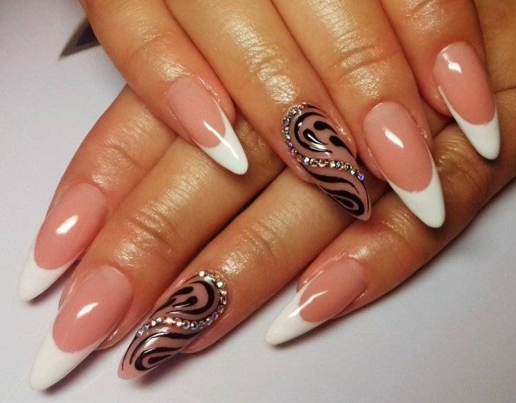 - Форма «стилеты» – длинные острые ногти. Свадебный французский маникюр на форме «стилет» подойдет для экстравагантных и неординарных личностей. Но такой вариант давно и надолго вышел из моды, как и «балерина».
