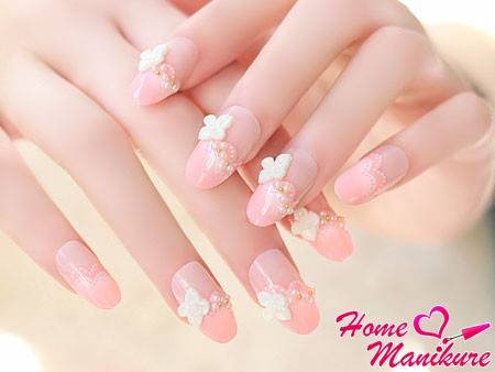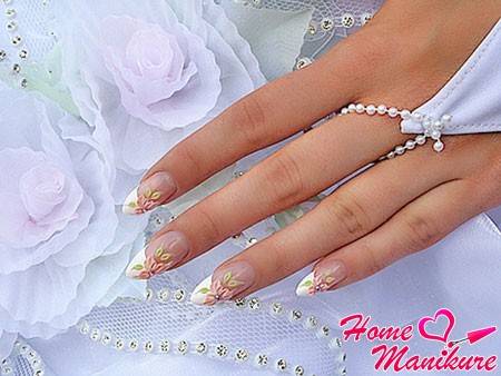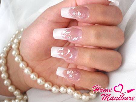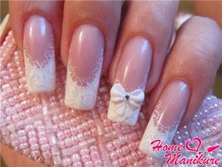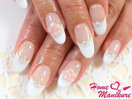 Еще одно оригинальное украшение френча на свадьбу – это акриловая лепка. Но здесь главное не переборщить: объемные композиции должны плотно прилегать к ногтевой пластине. Цвета лучше выбирать нейтральные: нежный розовый, белый, телесный. Можно украсить акриловые композиции маленькими бусинками или небольшим количеством блесток.