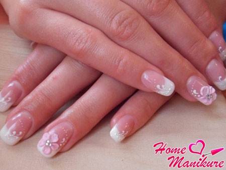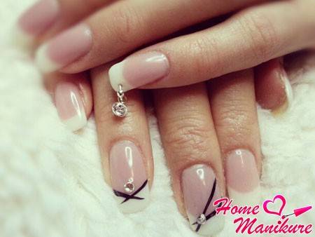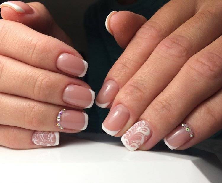 На средних и длинных ногтях с французской основой в пастельной цветовой гамме или модном стиле нюд отлично смотрятся камушки, на коротких не стоит злоупотреблять наличием блестящих декоративных деталей – лучше один-два стразика и красивая роспись.