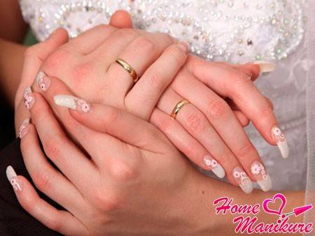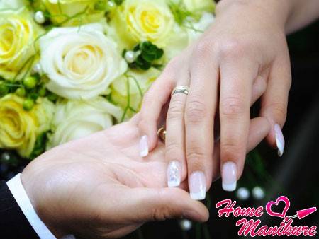 Если в период свадьбы планируется множество поездок, активных мероприятий и т. д., рекомендуется воздержаться от обилия камушков на ногтях и объемных деталей: такой маникюр хрупок и не очень практичен, декор может скалываться или отлепляться, еще недавно такие красивые ногти быстро придут в негодность.