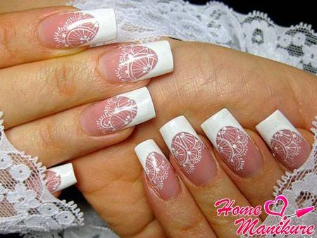 Преобразить свой праздничный дизайн можно с помощью стемпинга – удобного инструмента для создания идеально ровных рисунков на ногтях. Французский маникюр с кружевом выглядит очень романтично и сексуально. Чтобы убедиться в этом, посмотрите несколько красивых фото с кружевом и милыми завитками.