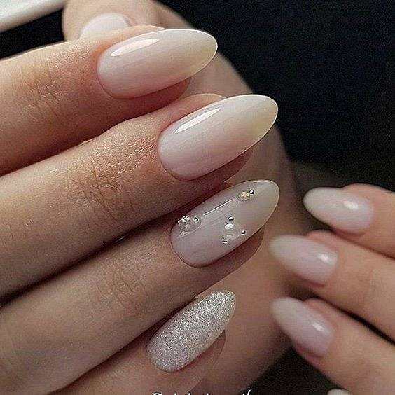 На миндальных ногтях красиво смотрятся треугольные, ассиметричные, ажурные лепестки. Овал зрительно делает пальцы более острыми, а американский вид дополняется блесками, наклейками.