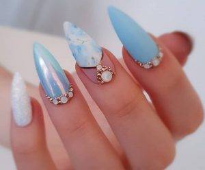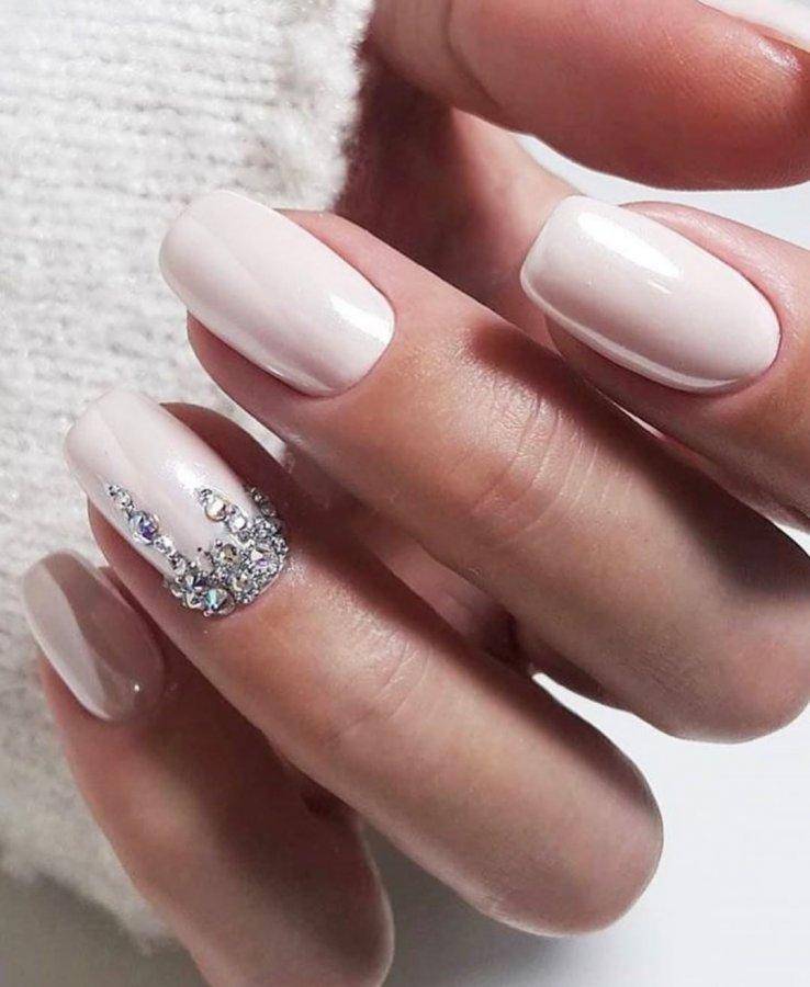 Нюдовые оттенки вот уже не первый год пользуются огромной популярностью в нейл-дизайне, даже если он относится к свадебному. Среди возможных вариантов – античная роза (пудра), светлый беж и даже небесный голубой, каждый из которых прекрасно сочетается с базовым декором в виде выложенных по ногтевому ложу в одну линию страз, самого мелкого шиммера, лепки и прочих вариаций на тему.