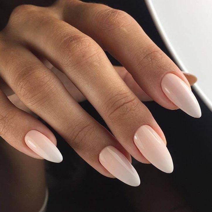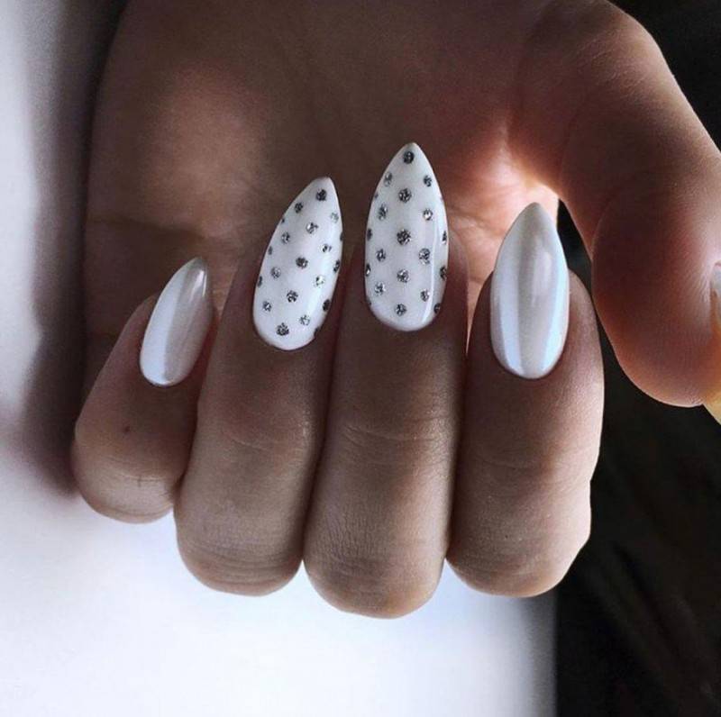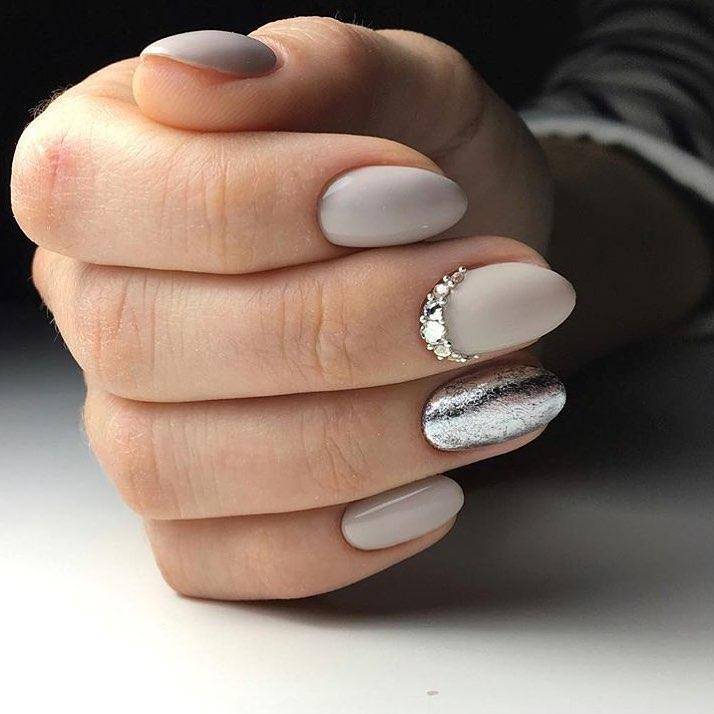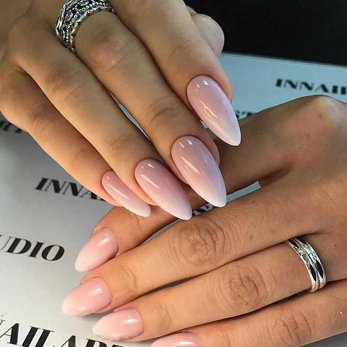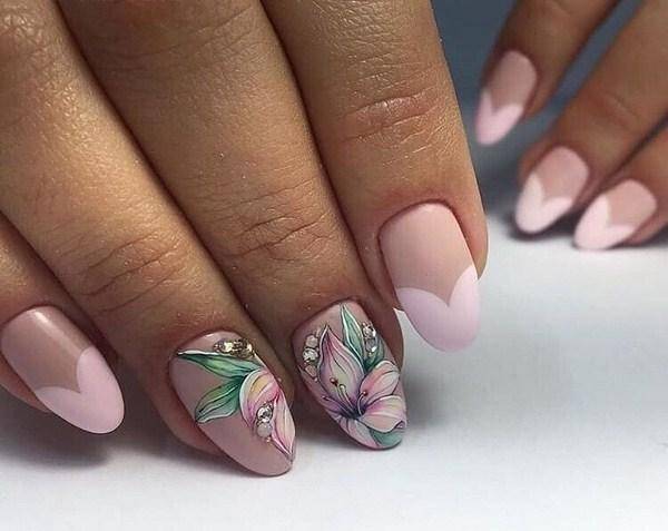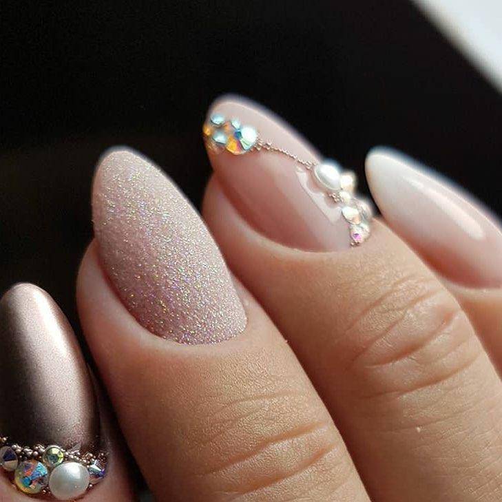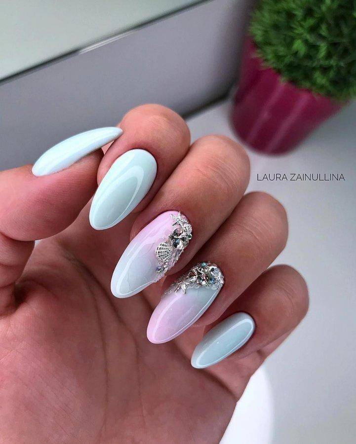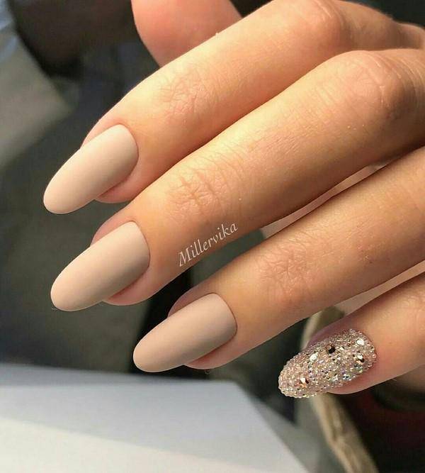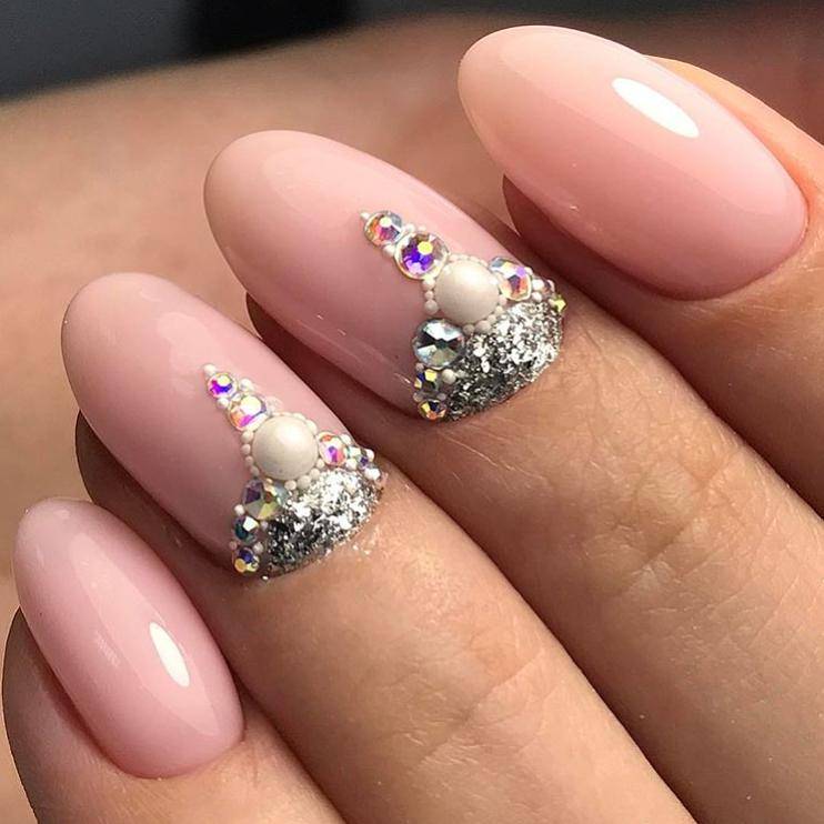 Овальные пластины в виде миндаля хороши с нюдовым матовым и глянцевым лаком, френчем, блесками, 3D-узорами. Это хорошая база для лунного дизайна с помощью страз, жемчуга, сердечек, блесток.